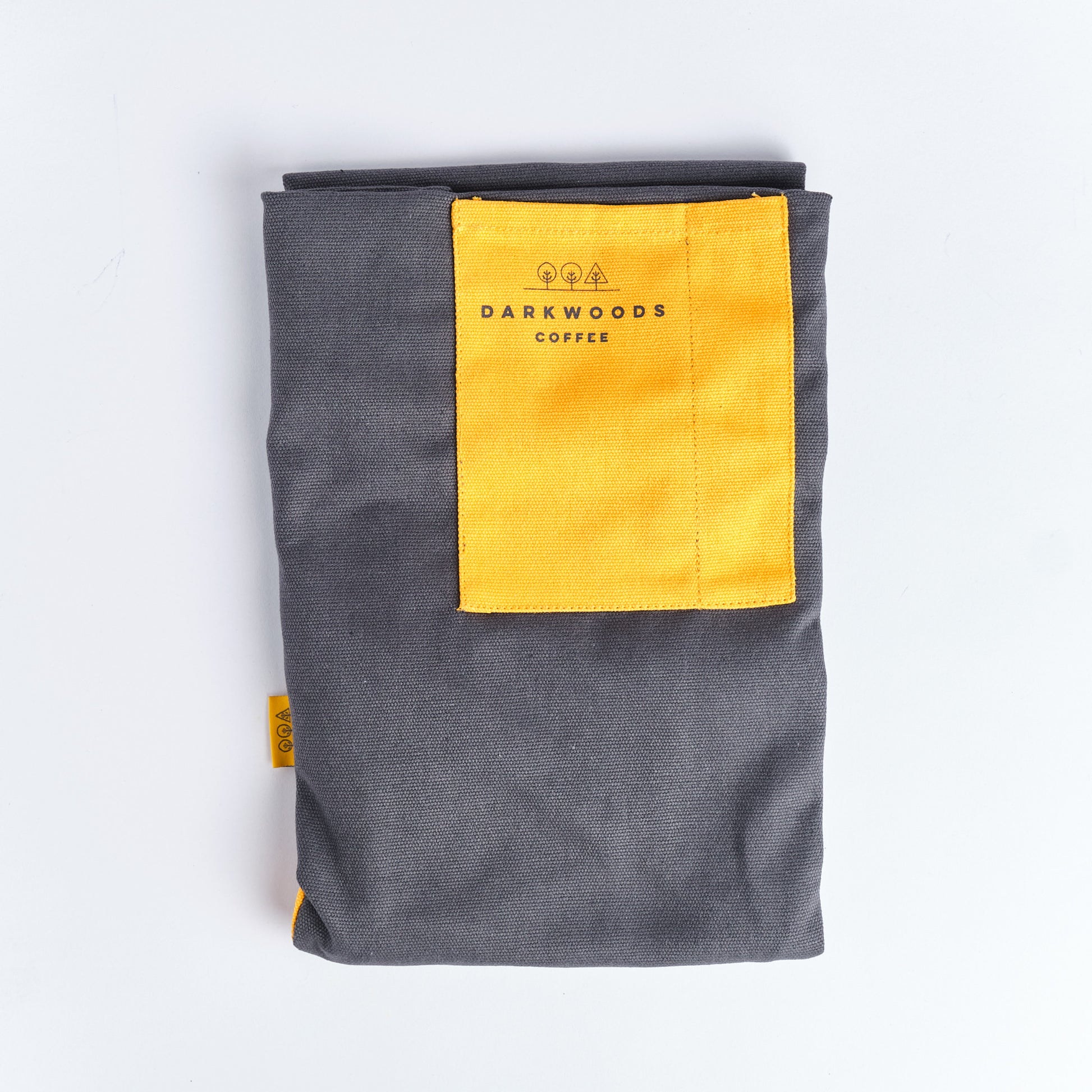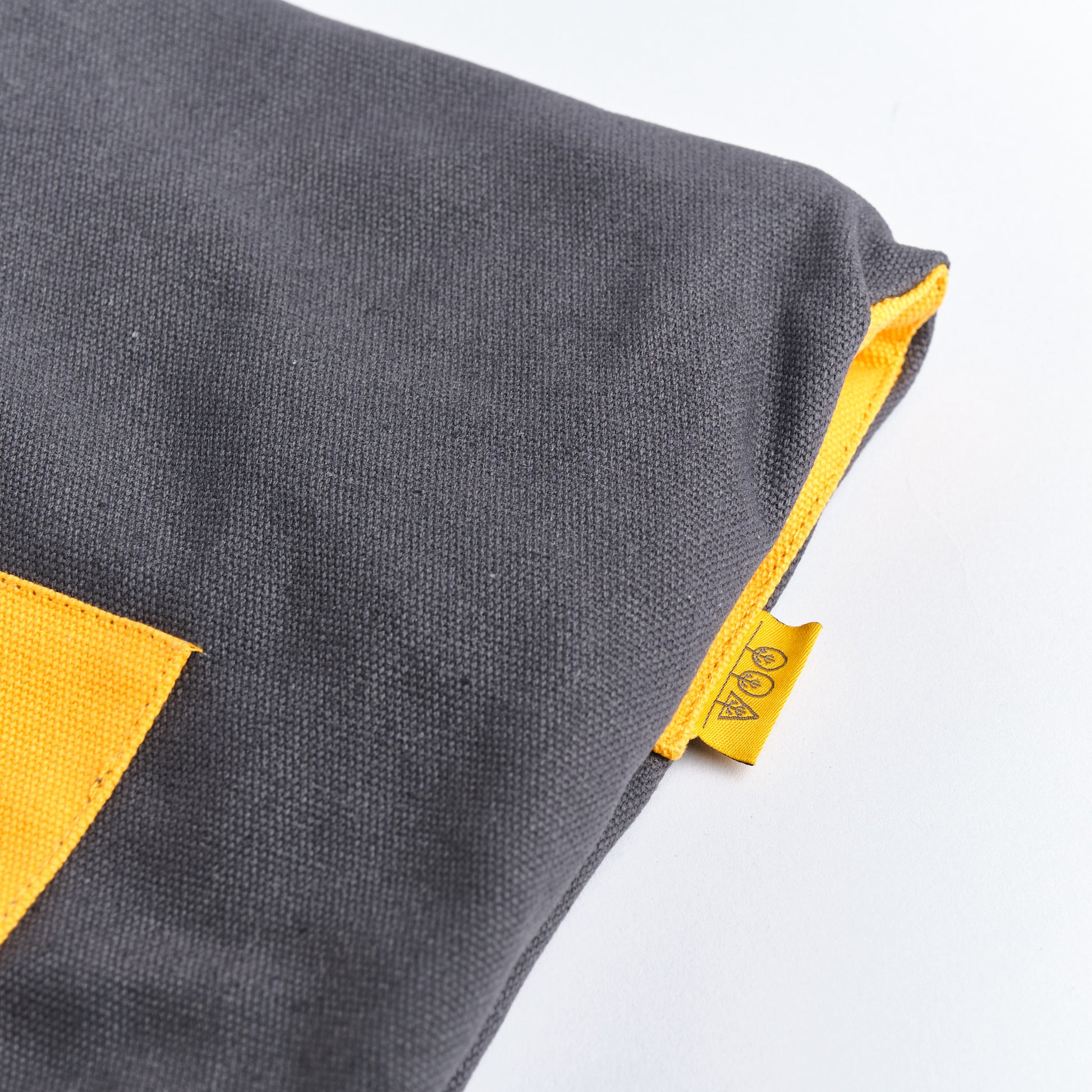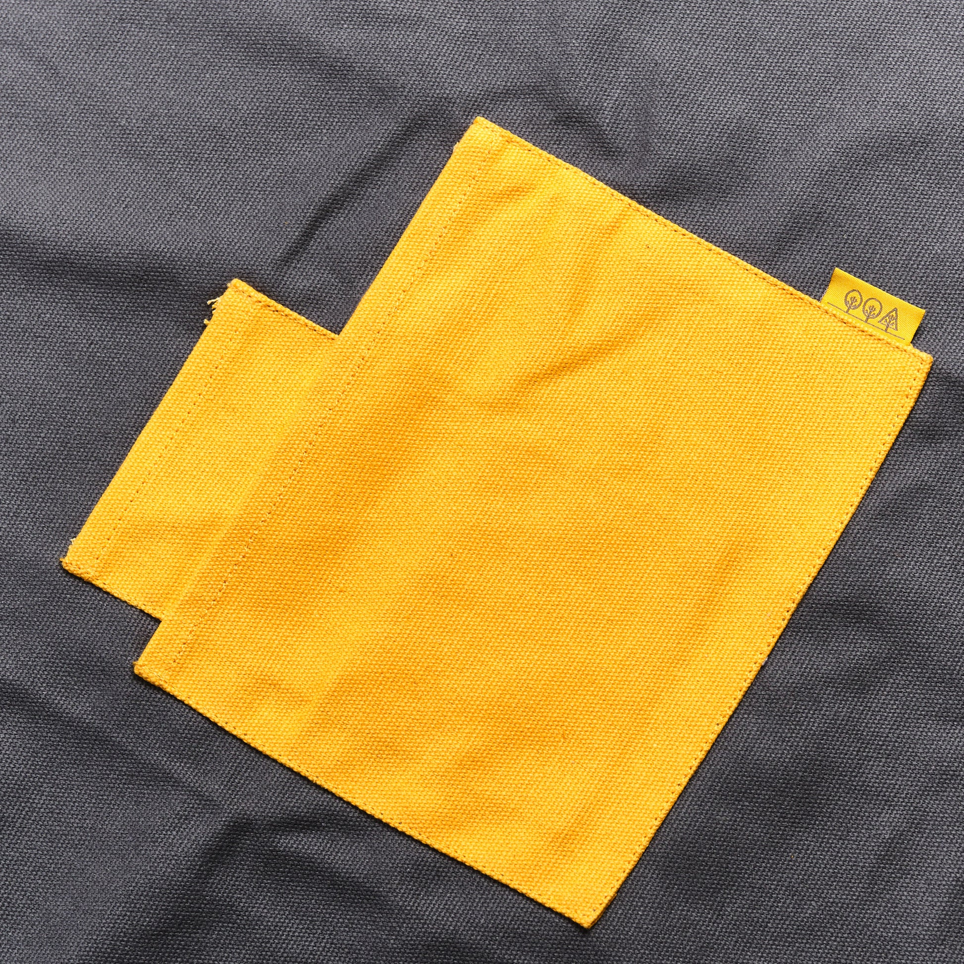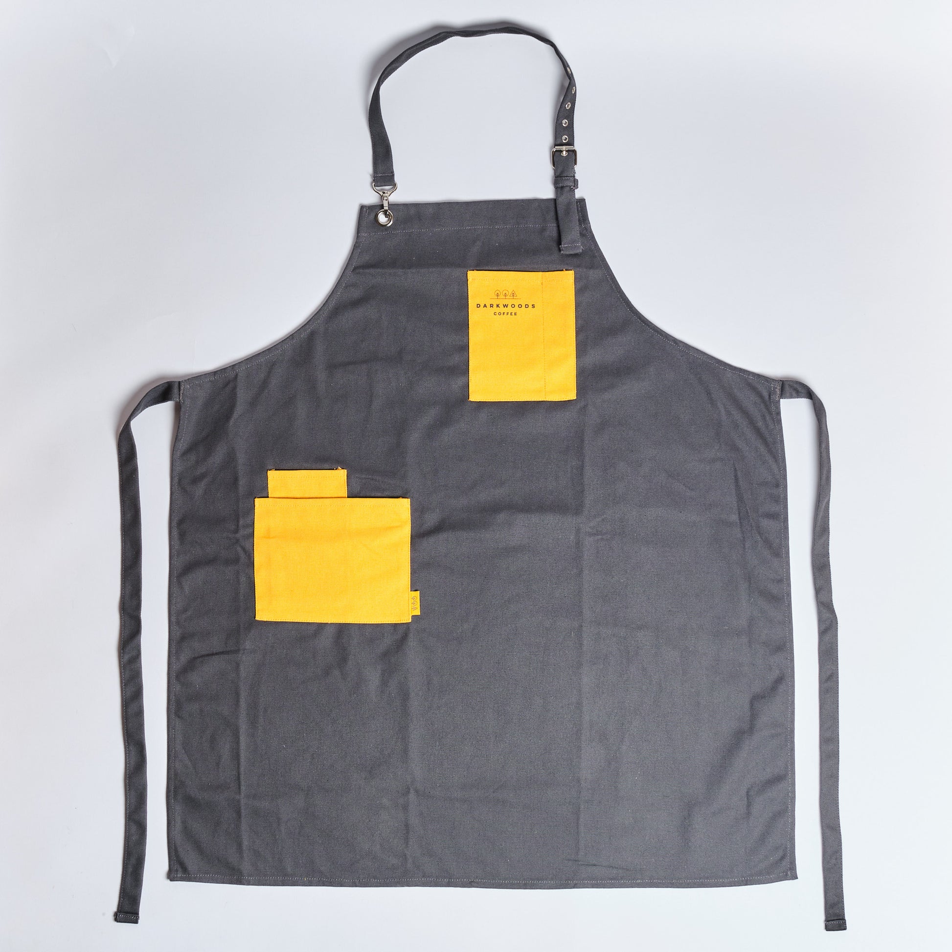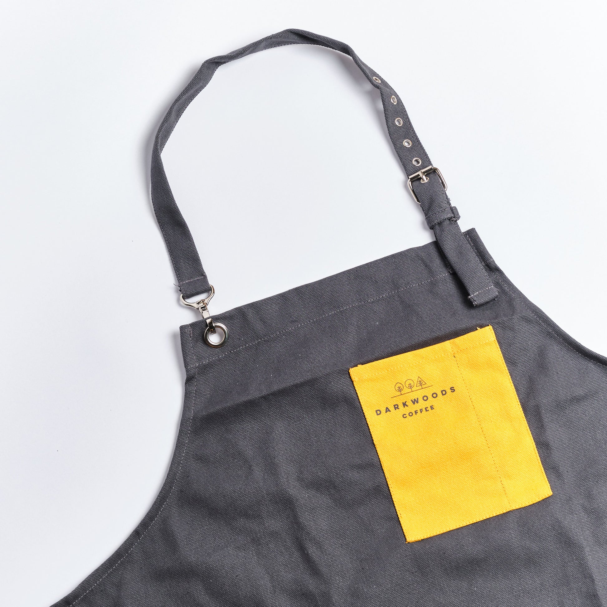 16oz dark grey canvas aprons, with contrasting yellow pockets (including pen slot). Screen printed one colour logo and woven label. Supplied with canvas wraparound tie, canvas head loop with eyelets and length adjuster finished with a chrome clasp.